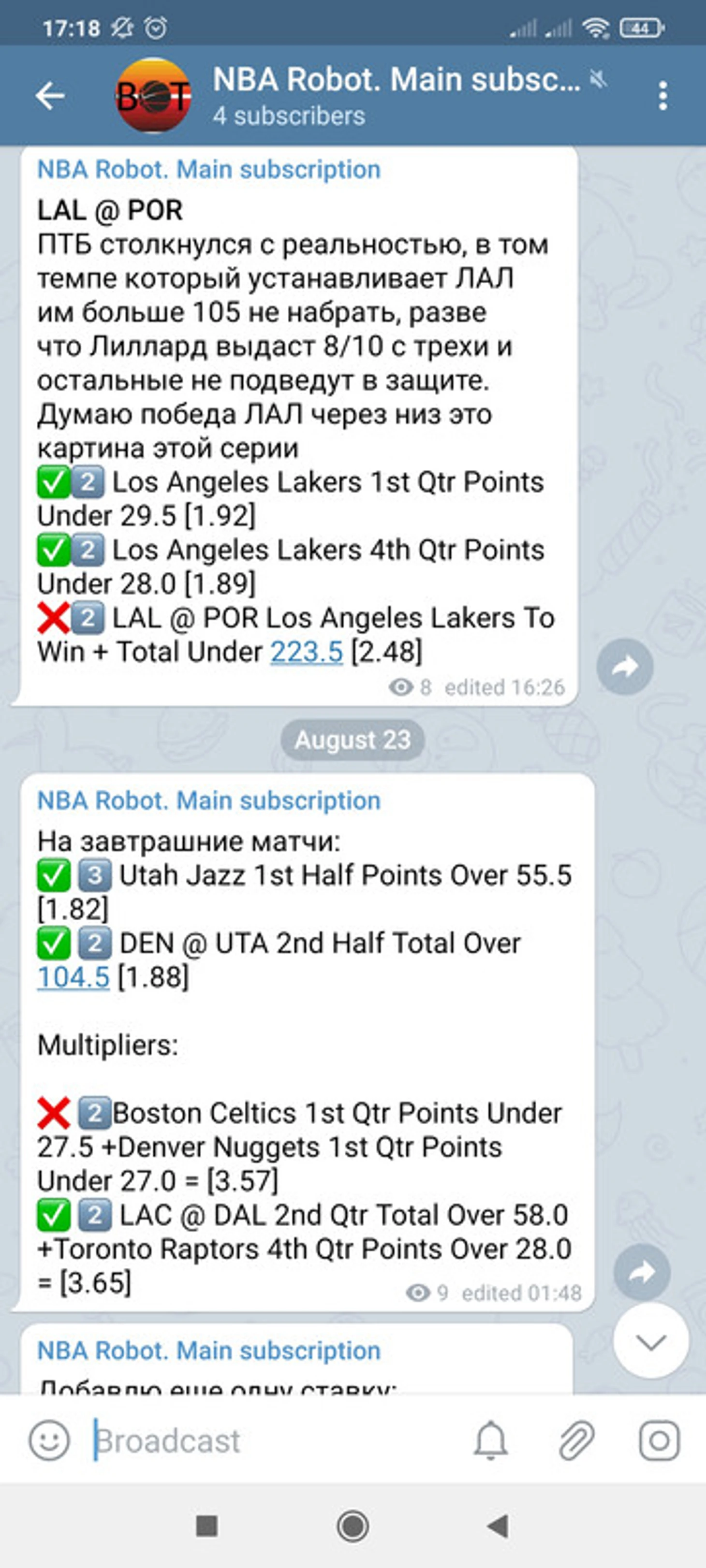 Эта подписка на ставки на НБА, в нее входят прогнозы на исходы матчей, тоталы, в том числе, а вернее сказать в основном по четвертям и половинам. Каждый день, примерно до 15.00 по москве приходит рассылка в телеграм, которая выглядит примерно так: