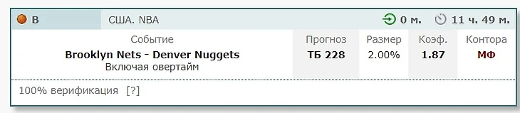 Считаю тотал на игру заниженным. Букмекеры выставили 227 на фоне относительно неплохой защиты Денвера в последних играх. Сегодня Бруклин должен показать что в Наггетс там не все гладко. Ну и свои дежурные 115 подопечные Нэша тоже должны пропустить. Как-то так.
