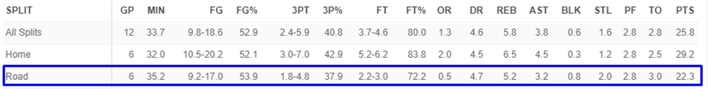 Его результативность падает на 7 очков, и зачастую он теряет в атаке издали, у него на 2.2 броска меньше, и на 1.2 точного меньше, а так же на 3.2 штрафных меньше.