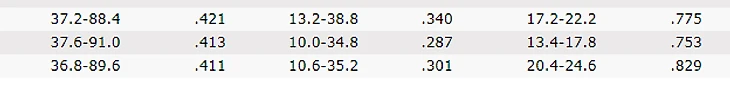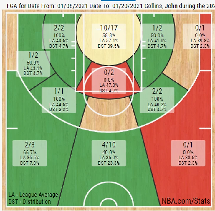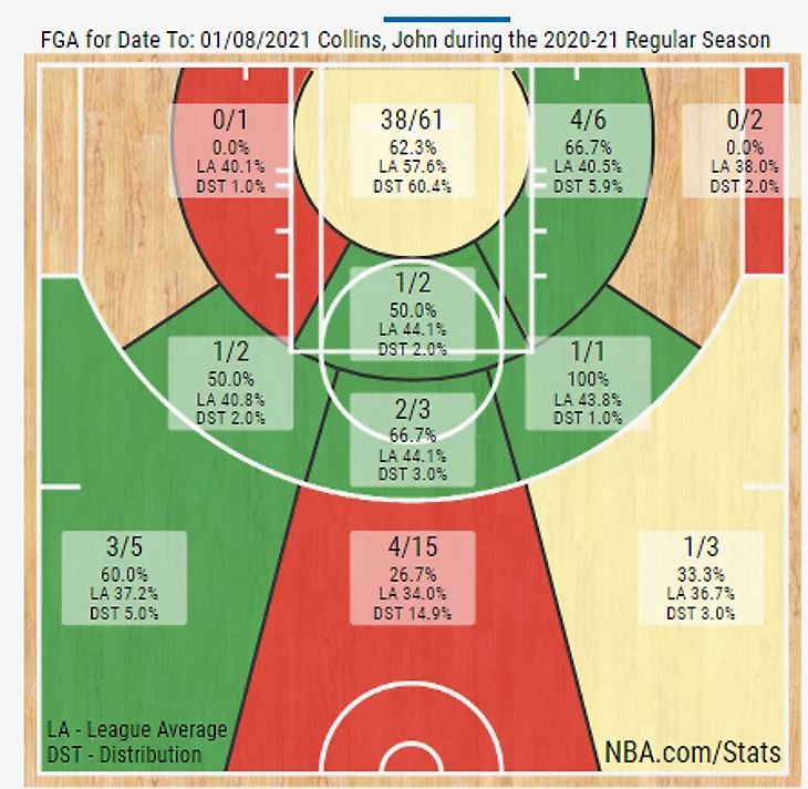 как видим Коллинз за 8 игр выбросил 61 бросок у кольца, еще 9 в пределах трехсекундной. всего 8 трешек по боковинам дуги и 15 по центру.