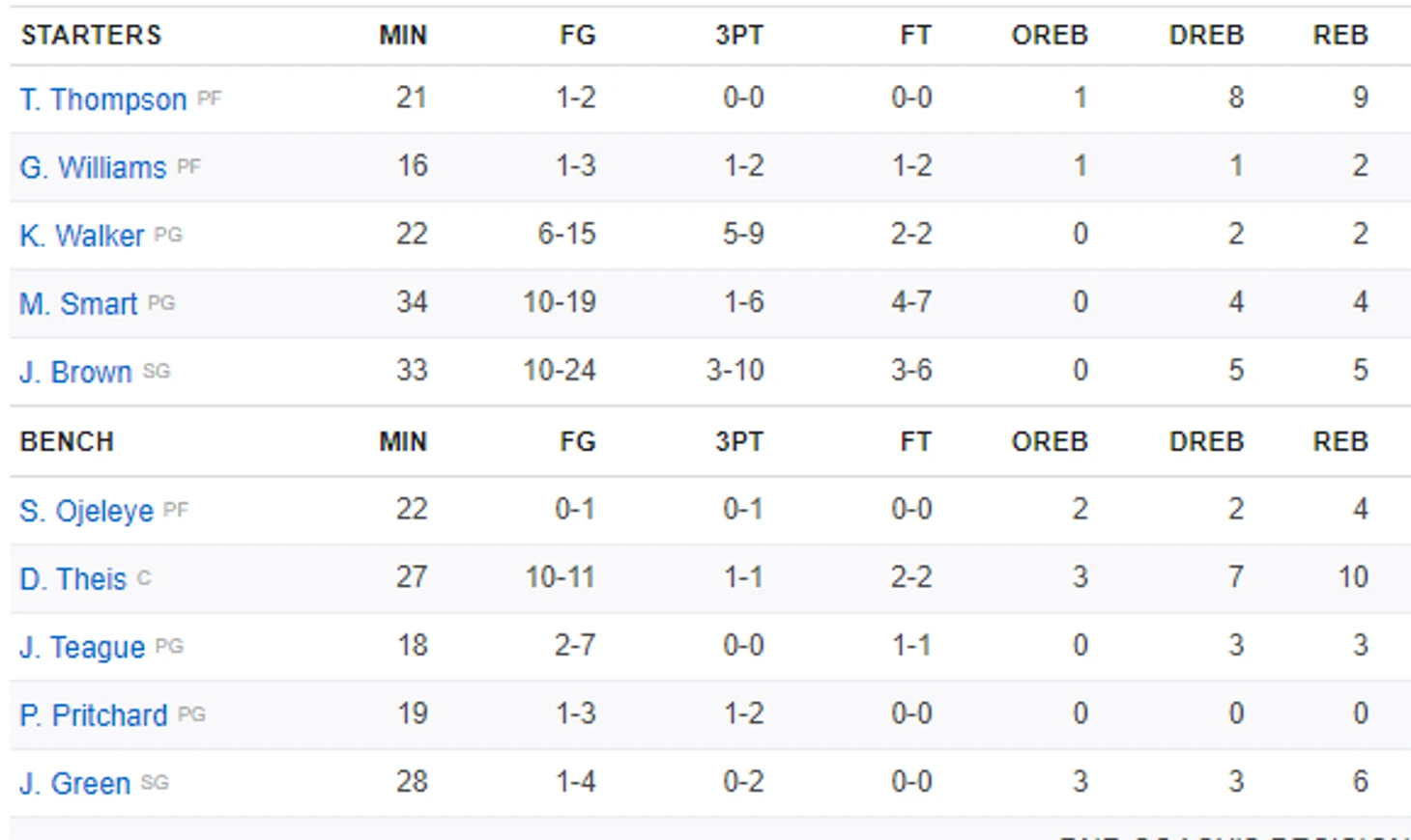 Вы посмотрите на эту феерию! Смарт 9-13 двушек! Браун 7-14 двушек, Тайс - 9-10 двушек! Это вообще как?? Шансы что это повторится, я бы оценил как минимальные! И если бы не Тайс, скамейка Бостона далеко бы отпустила 76х, потому что в сумме они занесли 4-15... и сюда не входит 2-5 Томпсона и Вилльямса!