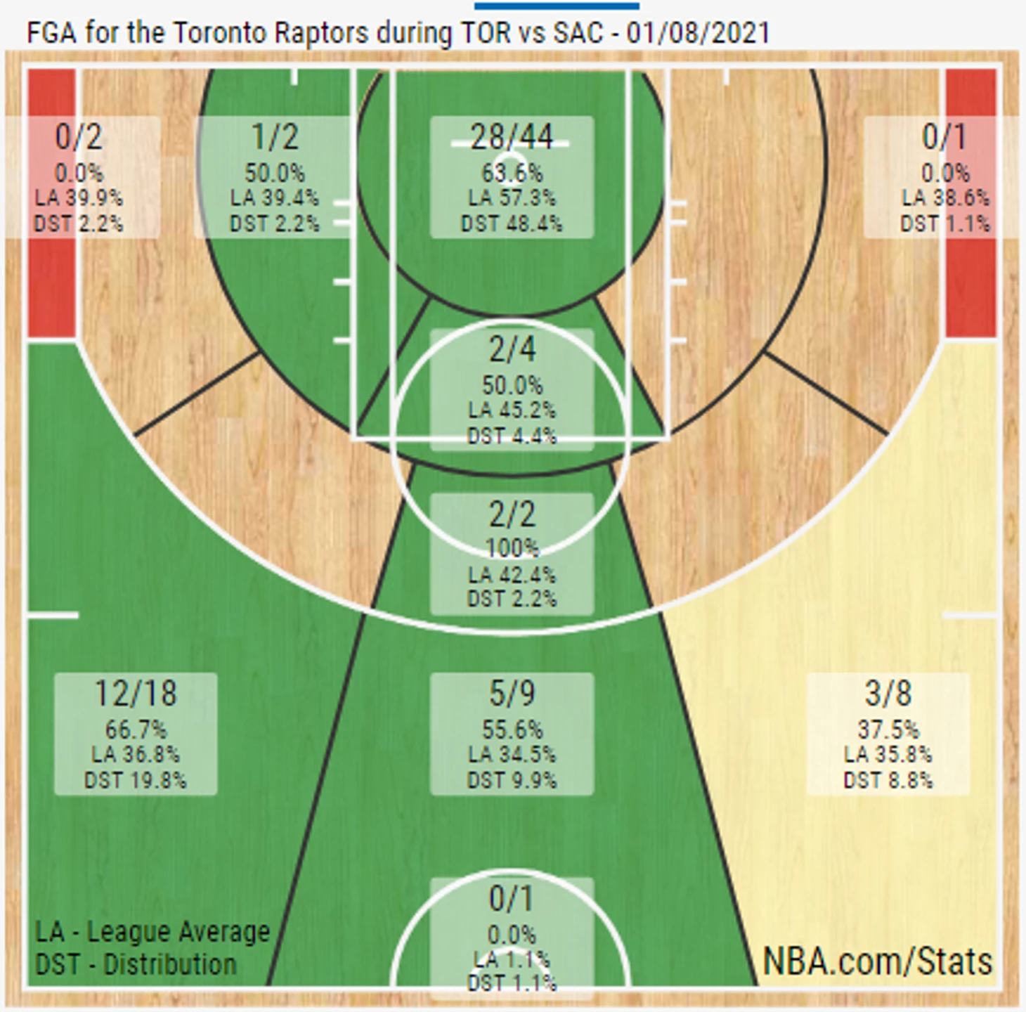 Дома они выбрасывают 45.7 трешек за матч! при 37% точности, Сакраменто на выезде пропускает 39.5% на дуге и всего дает набирать 117.5 очков. Рапторы очень плохи именно в двухочковом баскетболе - 43%, правда сегодня это не должно сказаться, Сакраменто пропускают 54.7% из под кольца и хуже них только Миннесота.