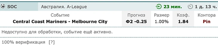 Если разбирать матчи предыдущих туров с участием этих двух команд, то можно обобщить: Централ Кост показывал достаточно хорошую реализацию своих моментов, а вот Мельбурн Сити не может пока найти свою игру в этом сезоне. Централ Кост в этом сезоне обыгрывал чемпиона прошлого года Сидней; сильного новичка Макартур; своего конкурента в борьбе за плей-офф Ньюкасл Джетс. При этом Маринерс дважды проиграли: сильным Сидней Уондерерс и Веллингтон Феникс. По проигранным матчам могу лишь сказать, что обе игры были равными, Маринерс пропустили в обоих матчах уже после 80-й минуты. Мельбурн Сити обыграл лидера (Брисбен Роар) в гостях, затем проиграл Аделаиде, обыграли сильный Вестерн Юнайтед, а затем проиграли не менее сильному Перту. С игрой не все гладко. Сити старается играть во владение, однако не всегда это получается в игре с равными соперниками. А даже если получается, то нередко команда все равно пропускает первой по ходу матча, а затем вернуться в игру уже бывает сложно, хотя в матче с Вестерном это удалось. Несмотря на все доводы сыграть фору или Центр Кост с иксом, я смею предположить, что Мельбурн Сити в этом матче победит. Но и чистую победу я брать не буду. Ставка: Мельбурн Сити (-0.25) за 1.84 в пинке.