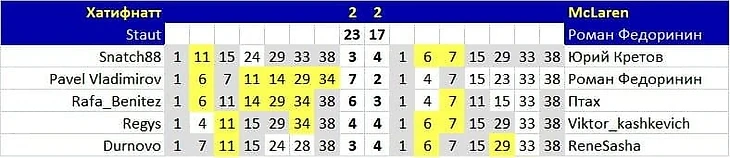 Полуфинальные пары выглядели так: Эйфории достался в соперники Интер, а Макларен сразился с Хатифнаттом. И если в первой паре результат оказался справедлив и очевиден, Эйфы уверенно переиграли команду Змицера и по линиям (3:1) и по УВ (21:17), то второй полуфинал подарил нам удивительные перипетии с небывалой развязкой. Хатифнатт, казалось бы, был сильнее и должен был уверенно выходить в финал, но невероятное стечение обстоятельств сыграло против моей команды. Всё решила расстановка по линиям. Это наихудший вариант расположения прогнозов, который только можно было представить. Судите сами.