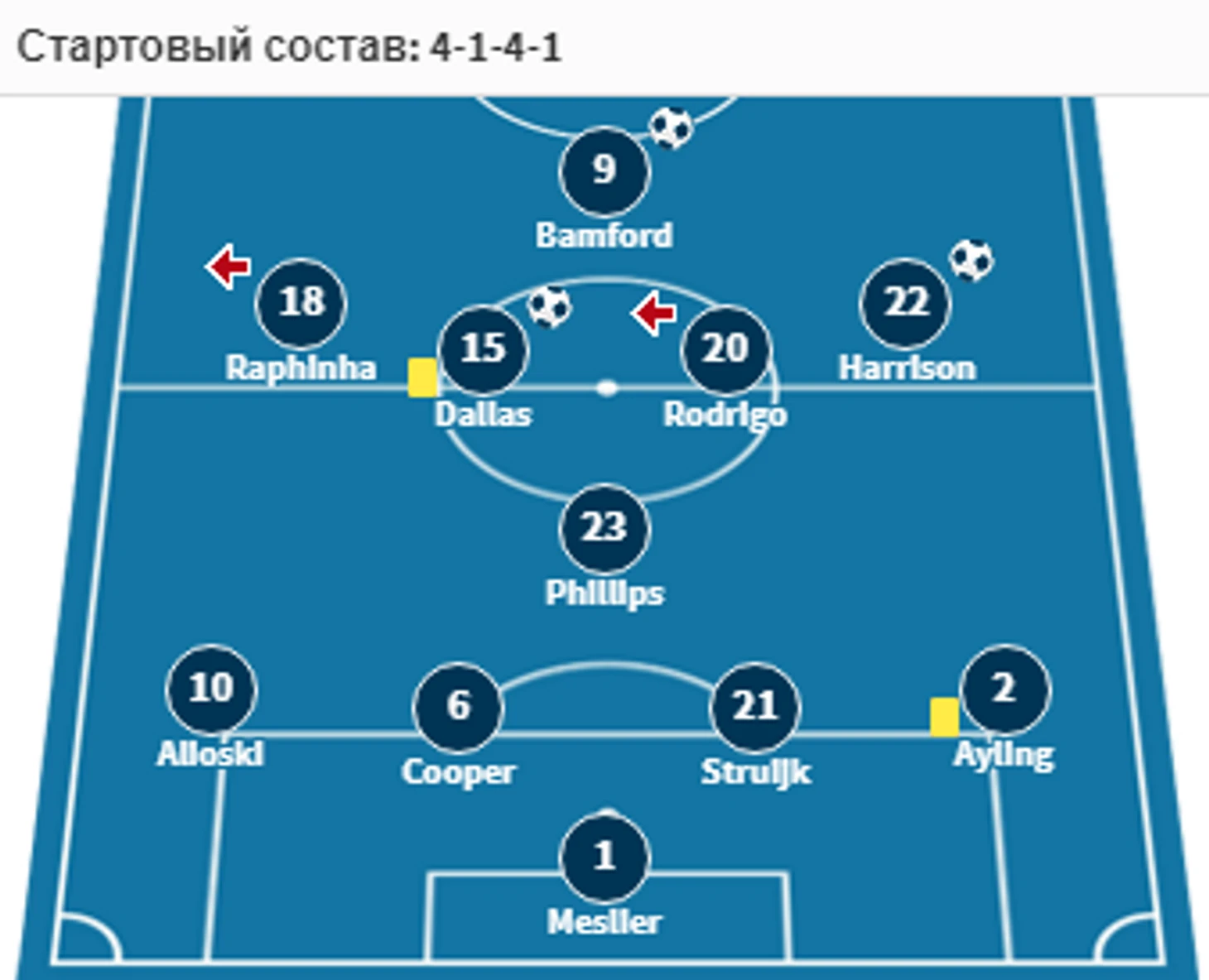 Вместо Родриго конечно выйдет Клих, который до недавних двух матчей выходил на поле каждый матч на протяжении 2 сезонов кажись. В целом я не сомневаюсь что Бьелса не будет менять состав который принес ему уверенную победу над Лестером на его поле. Поэтому защита такая же Эйлинг - Стрейк - Купер - Алиоски, над ними Филлипс.