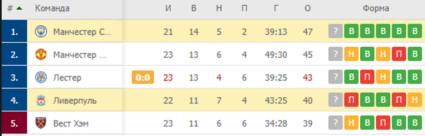 Довольно странно видеть Ливерпуль на 4 месте, и до Ман Сити им далеко, по потерянным все 10 очков, и это уже будет не догнать. Я не сомневаюсь что именно Сити и станет чемпионом, у них на 2 игры меньше чем у МЮ, и разница может дойти до +8. Это не отыграть, против команды что пропустила 13 мячей за 21 тур!