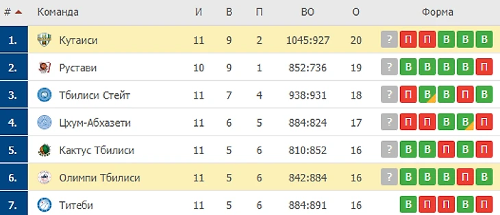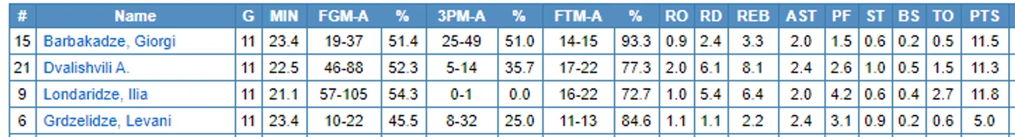 Из местных игроков остались лишь эти четверо, Барбакадзе здесь единственный кто может трешку положить, и получается что на всю команду с ее хваленной атакой в 95 очков, остались два человека что могут попадать издали, Двалишвили и Лондаридзе не кидают трешки, Грдзелидце всего 25%. И ничего убедительного, что после возобновления чемпионата они дома проиграли 10й команде лиги Вера Тбилиси со счетом 71-96 у которых два американца. Касаемо трешек было 5-19 от Кутаиси..