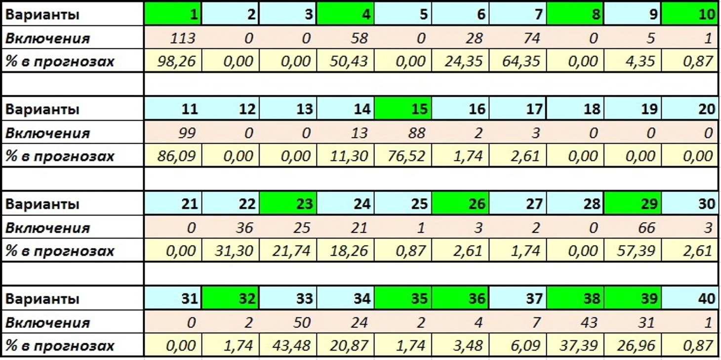 1-й тайм был очень похож на наш стартовый матч. Угадали исход – у нас на четырех линиях сыграл вар.4 (плюс на одной – вар.23), у соперника – такое же количество мимо вар.24. После этого могли проиграть только при большом стечении обстоятельств: зайти – 29, 33, 39, не сыграть – 7, 34, 38.