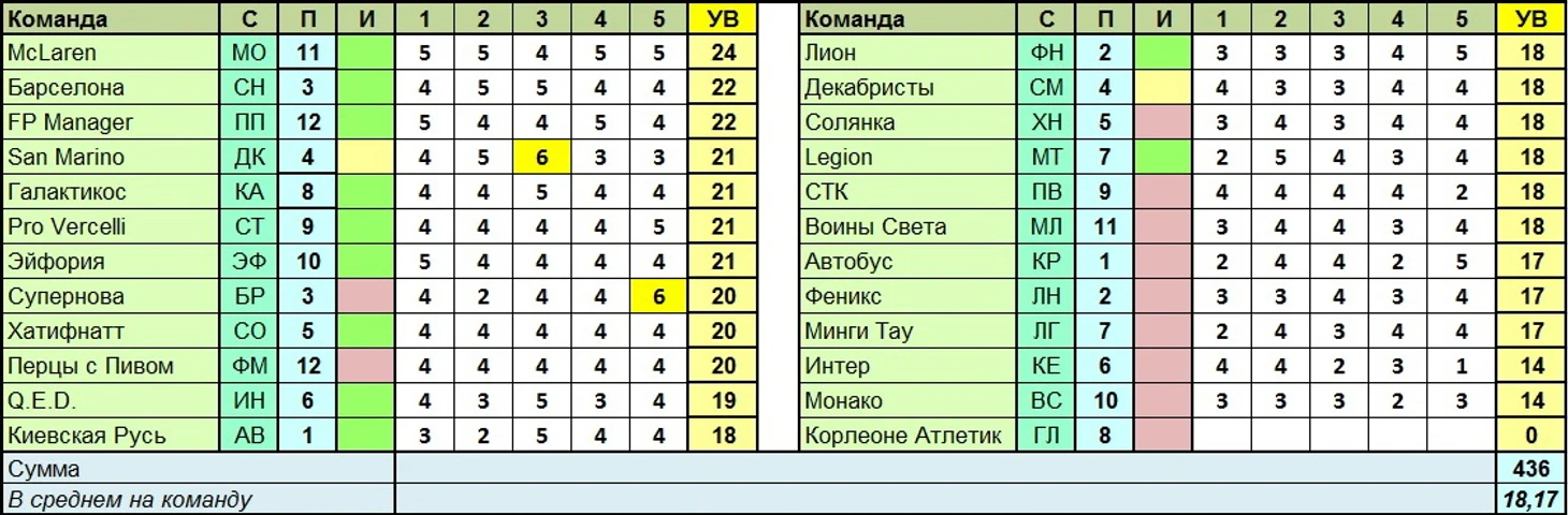 Соперник загрузил по полной на 38, а мы полностью проигнорили этот вариант, вложились в другие. Так что поначалу было тревожно. Очень помогли голы в первом тайме и зашедший 39, после этого стало полегче. А когда счёт стал 2:1, уже было очевидно, что скорее всего мы выиграем, даже несмотря на отсутствие у нас 38. Так оно и случилось. Наше 15 против ихнего ничего дало нам небольшое преимущество, которого в итоге хватило. Отдельно отмечу качество прогнозов в нашей команде. Несмотря на некотроые различия, у всех игроков, в том числе и запасных вышло по 4 УВ. Редкий случай, когда знать бы наперёд – и можно не мучиться с выбором состава, ставь любого, результат был бы идентичным.