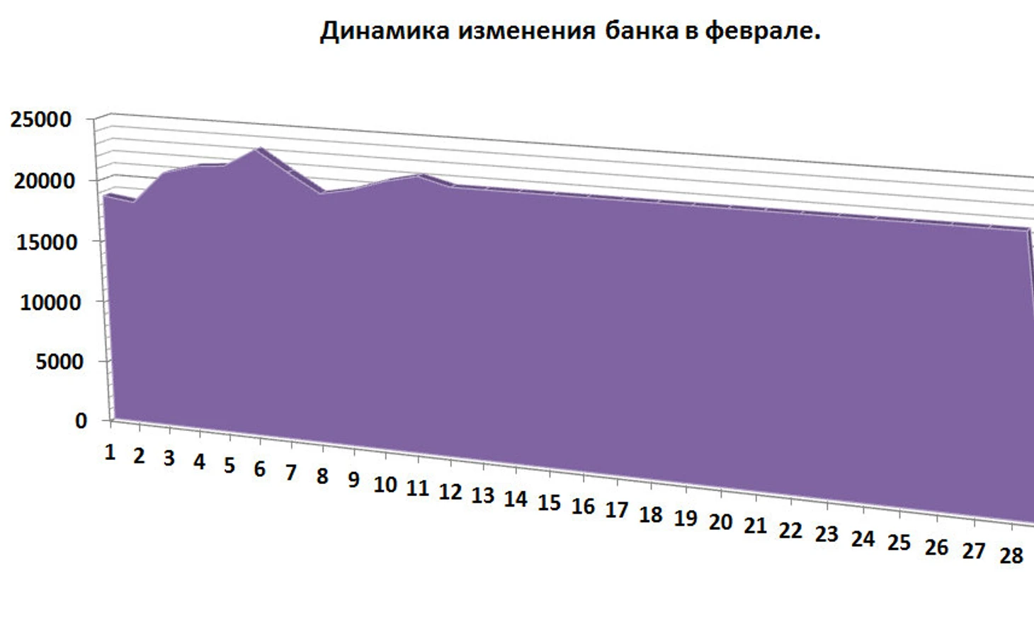 Приветствую, Дорогие Друзья и любители ставок!!!! Подбил промежуточные итоги 12-ти прошедших дней февраля. За отчетный период было сделано 28 ставок, из которых зашли - 15 (53,57%). Средний кэф зашедших ставок составил - 2,023. Из 12-ти дней семь удалось закрыть с профитом, а пять с убытком. На данный момент банк подрос на 9,46% или +1859, и сейчас равен - 21501.