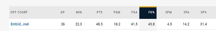 Потому что когда Эмбида нет, атака проседает до 43.8% с игры и 31.4% издали, в то время как с ним