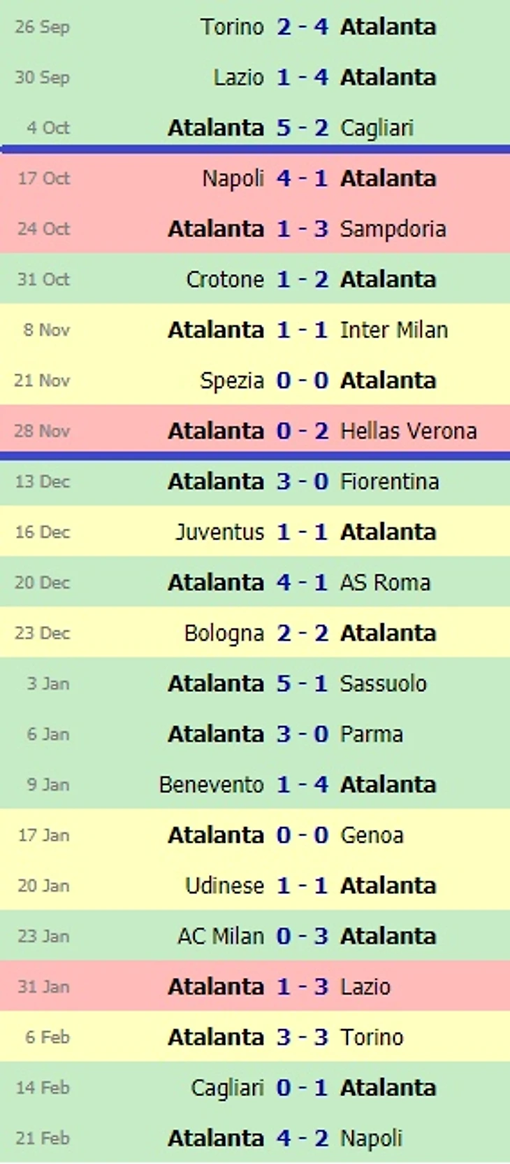 Аталанта мощно стартовала - 3 уверенные победы в 2-3 мяча и аж 13 забитых. Затем началась Лига Чемпионов и результаты во внутреннем первенстве пошли вниз, на отрезке с 17 октября по 28 ноября была лишь одна минимальная победа над аутсайдером Кротоне при 3 поражениях и 2 ничьих. После окончания групповой стадии ЛЧ вновь положительная динамика, только 1 поражение (от Лацио) при 8 победах и 5 ничьих.