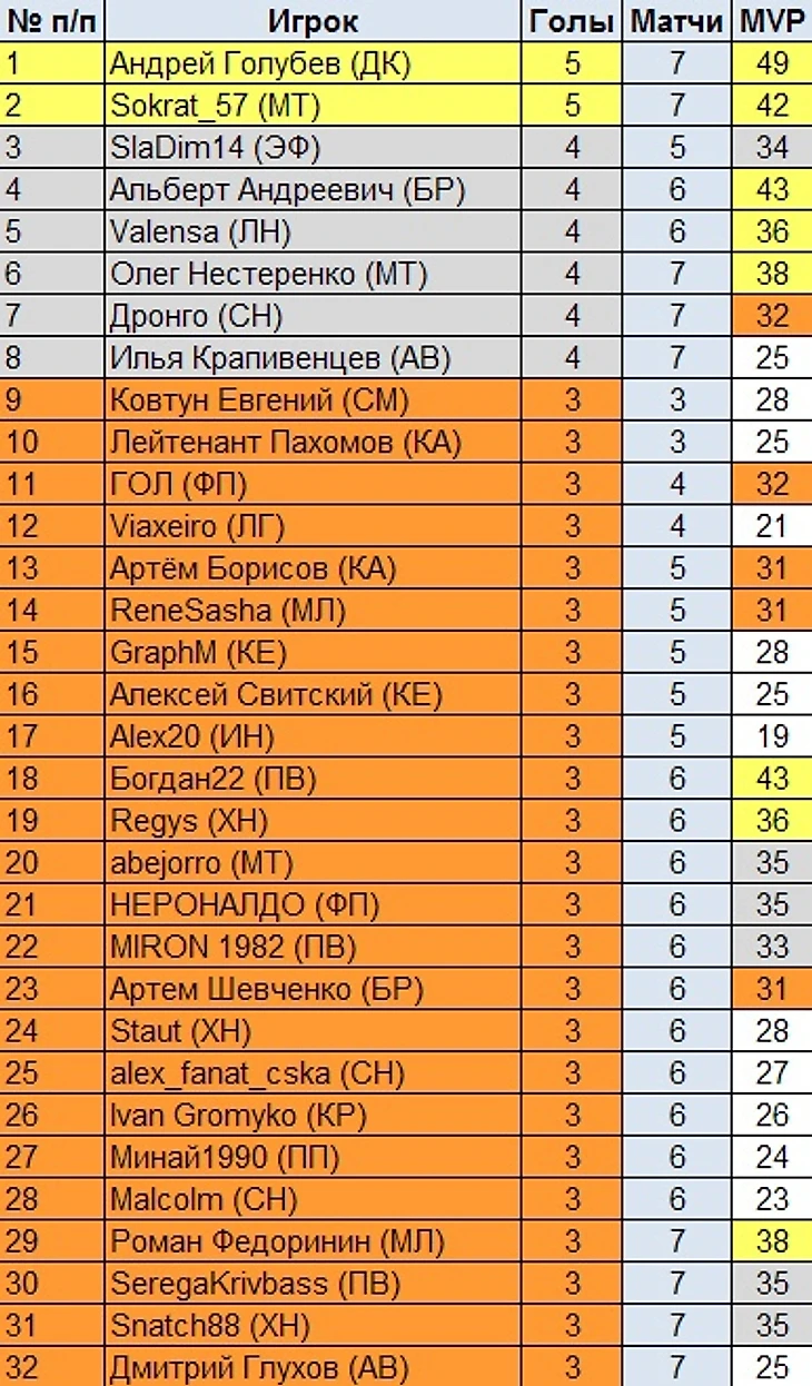 Нападающие: asphalt (СТК), Leanid Aksiutin (Декабристы), Птах (McLaren). Первые двое были лучшими в своей команде, в том числе благодаря их стараниям были одержаны победы с минимальным перевесом, ну а у игрока “маков” был очень серьёзный соперник.