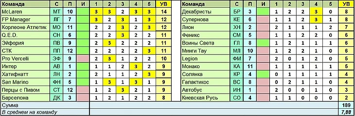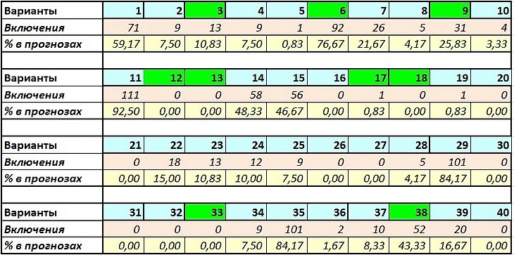 Оказывается, этот МДП был подходящим, чтобы взять прогноз на счёт 0:0. Такие мысли в тренерском чате проскакивали, но никто не решился на подобную авантюру. Это напомнило мне, что Ямато некогда делал таблицу, отображающую частоту прохода вариантов, и сделал свою. В ней указано, сколько раз тот или иной вариант взяли в конкретном туре, а зелёным подкрашены зашедшие варианты.