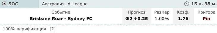 7) Брисбен Роар - Фк Сидней Ф2 (+0.25) за 1.82 по пинке.