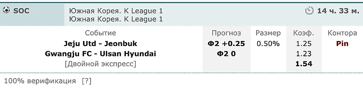 1) Экспресс. Чэджу Юнайтед - Чонбук Ф2 (+0.25) + Гванчжу - Ульсан Ф2 (0) = 1.52.