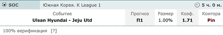 На сегодня есть один неплохой вариант. Мне он понравился на выходных. Ульсан поделил очки с Пхоханом. Чеджу - команда, откровенно говоря, слабая. Я видел две игры Ульсана. Играли они хорошо. Как обычно, команда будет бороться за чемпионство с Чонбуком. Вообще, я считаю, если коэффициент на победу Чонбука/Ульсана выше 1.67, то надо брать. В прошлом сезоне обе команды выиграли по 15 игр из 22. Итого: победа Ульсана за 1.77 по пинке (а я брал за 1.7). Конечно, может, буки знают что-то особенное, но у меня очень большие сомнения на этот счет.