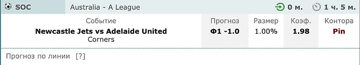 1. Ньюкасл Джетс - Аделаида Юнайтед Ф1(-1) УГЛ за 1.98 по пинке. Статистика Ньюкасл с данной форой по сезону 6-6. Джетс создают в среднем 8.1 угл за игру; допускают 5.9. Выглядит не очень, но как и в ситуации с Вестерном дома с угловыми все гораздо лучше. Дома Ньюкасл пробил данную фору в 4 матчах (не пробил только в 1). Дома создают в среднем 9.8 угл; допускают 3.2. Перейдем к Аделаиде. Статистика с Ф(+1): 5-2-4. Аделаида в среднем создает 4.2 угл; допускают 7.1 угл; в гостях создают 3.3 угл; допускают 8.8 угл. В гостях Аделаида проиграла по этому компоненту в 4 матчах; 1 матч проиграла с разницей в 1 угловой (те возврат); в 1 матче данная фора прошла.