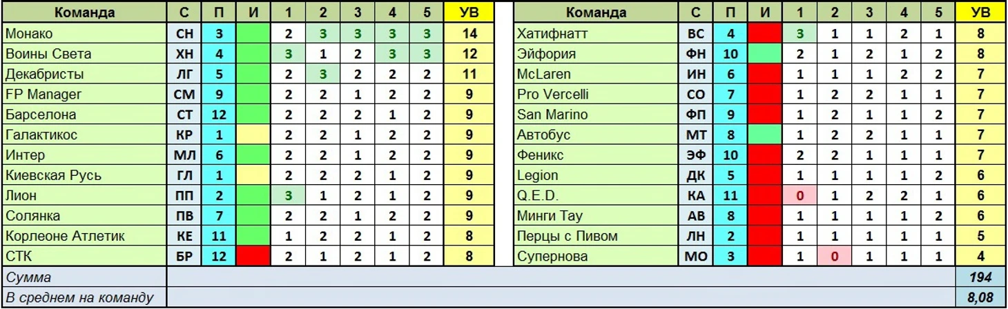 Давайте я вопреки традиции в эту рубрику поставлю не игроков или какую-то команду, а целую группу людей, занимающих административную должность:) Бессмысленный, но забавный факт. В прошедшем туре больше всех пострадали те, кто занимается организацией сезона. Модерские команды, которые, как известно, «подмяли под себя всё» в этот раз попали под дружный каток коллективов, набравших больше всех УВ в туре. Хатти, Суперы и Легионеры ничего не смогли противопоставить слаженному трио «Воины-Декабристы-из Монако». 12, 11 и 14 УВ соответственно – столько набрали соперники судейской бригады 7-40 и вашего автора. Заговор против модераторов?