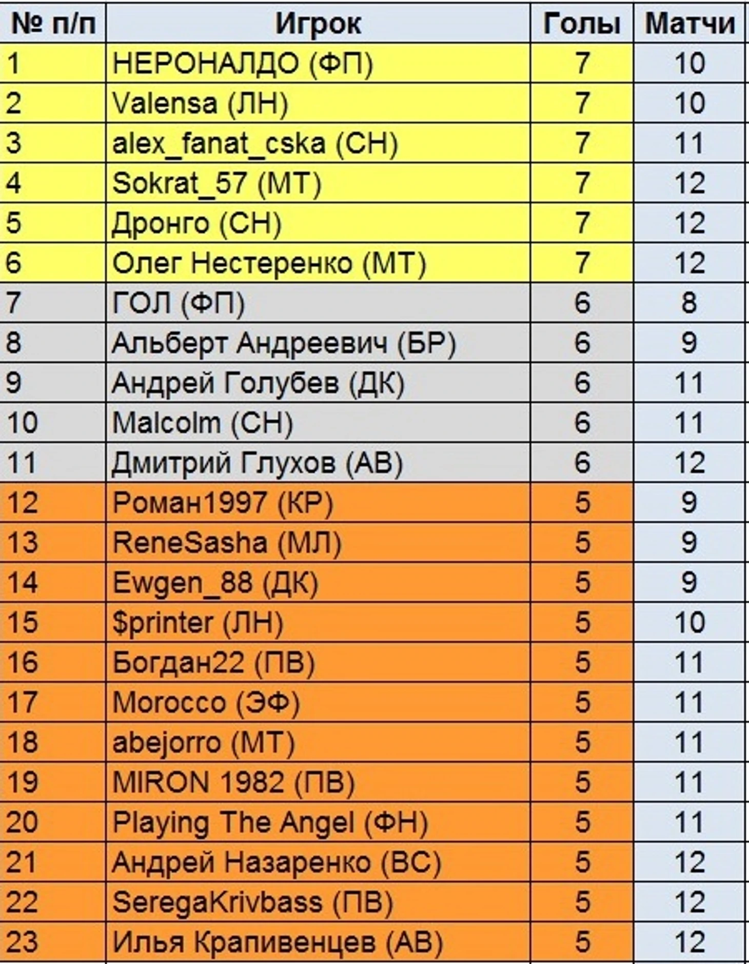 В списке бомбардиров шестивластие. У шести игроков по 7 голов.