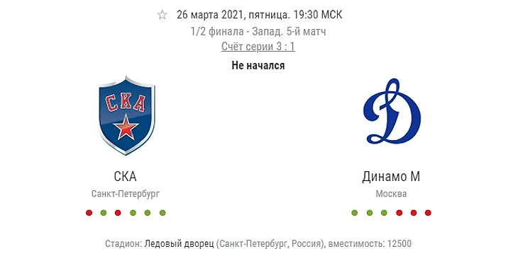 СКА остался последний шаг до победы в серии, в которой он не выглядит сильнее соперника, каждый раз динамовцам чего-то нехватает, возможно это и есть разница в уровне команд. В этом розыгрыше тенденция на короткие, незатяжные серии, дома питерцы будут очень мотивированы закончить серию и не дать москвичам опомниться. Очень много будет зависеть от дисциплинированности  команд, москвичи получают много удалений, которые СКА реализует. Рискну и возьму победу в матче СКА.