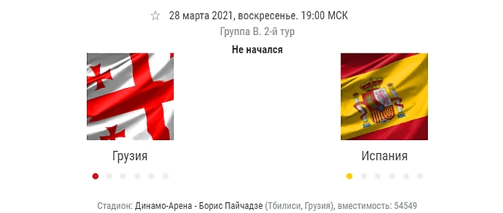 Обе команды неудачно начали отбор, Грузия минимально уступила Швеции 1-0, Испания не сумела одолеть Греция 1 - 1. Можно сказать, что у обеих команд неудачная полоса, в своих последних 5 матчах Грузия не одержала побед, Испания выиграла однажды (Испания — Германия 6:0). История личных встреч намекает на то, что матч получится не слишком результативным, в матчах между командами не забивалось больше 2 мячей. Несмотря на выше написанное предлагая рискнуть и поставить на результативный футбол от испанцев, после обидной ничьи с Грецией они выйдут с высокой мотивацией и должны победить уступающего в классе соперника.