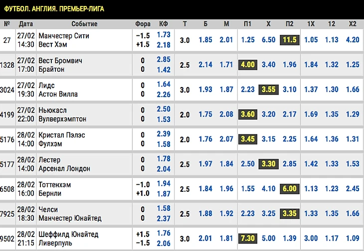 Мы берем в расчет абсолютно все матчи турнира, выбираем самый большой коэффициент по линии основных исходов (победа 1-й команды – ничья – победа 2-й команды) и ставим его по флету. Для примера матчи одного из прошедших туров и принцип выбора.