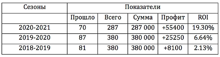 Этот метод достаточно прост и приносит профит. Тот случай, когда не стоит усложнять. Конечно, когда уже наварен текущий плюс, то до конца сезона может получиться небольшой откат, судя по цифрам прошлых сезонов, либо мы имеем сезон неожиданных результатов, если судить из вероятностей выставленных букмекерами в линии.