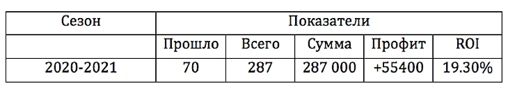 Удивительно, но в этом простом и даже скорее примитивном подходе есть профит. Причем, можно было сослаться на статистический флюк, но я посчитал и два прошлых сезона (сильно глубоко тоже не лез) и получил два плюсовых сезона, с вполне рабочим капперским ROI.