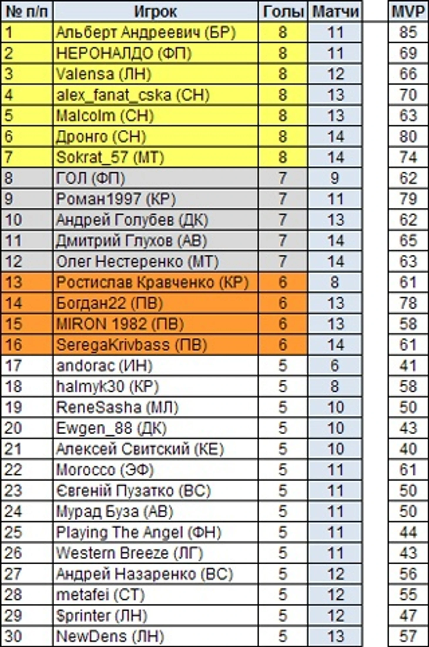 Нападающие: halmyk30 (Киевская Русь), Rafa_Benitez (Хатифнатт), Брулин (Солянка). К первым двум игрокам, взявшим 6 УВ, хотелось добавить игрока с 5-ю, но с индивидуальным прогнозом, чтоб был угадан победитель матча. Среди таковых (да их по пальцам руки можно было пересчитать!) нашёлся игрок “Солянки”, кстати, представитель “Хатифнатта” тоже отличился в угадывании исхода матча (и обоих таймов).