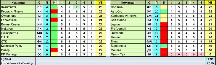 Не обошлось без неприятностей. В этом туре случилась неявка, хоть и всего вторая общим счётом за сезон. «Отличились» Минги Тау. Причём ситуация в их несостоявшейся игре сложилась уникальная. Барселона, соперник Мингов, выбила не так уж много УВ, расположившись по итогам тура на предпоследнем месте по этому показателю. Но благодаря технической победе взлетела аж на вторую строчку таблицы, а вот горцы опустились на десятую. Давайте представим, что клубный автобус довёз-таки команду на игру. Что мы увидим? С большой долей вероятности Минги Тау выиграли бы этот матч и сами заняли бы 2-е текущее место, а Барса опустилась бы… угадали… на 10-е. Какие только фортели не подбрасывает нам Случай.
