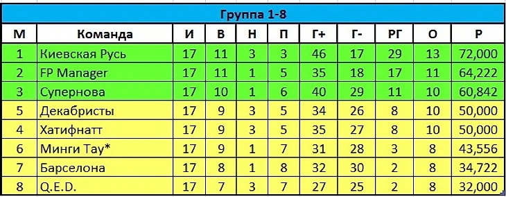 "Барселона, потерпев поражение от Pro Vercelli, выпадёт из четвёрки в случае победы любых двух команд из шести: Эйфории, Q.E.D., Корлеоне Атлетик, СТК, Солянки и Автобуса."