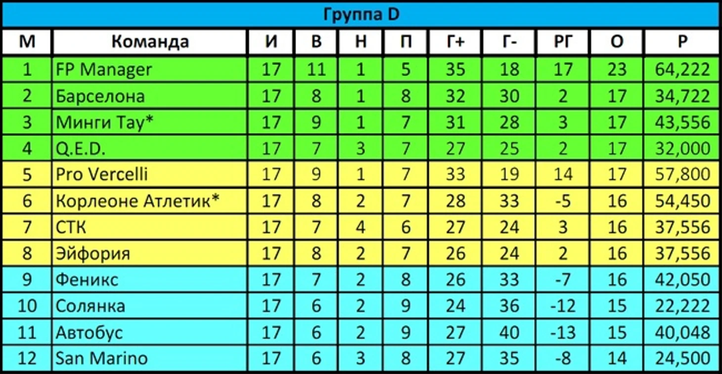 Обидно за итальянцев. Pro Vercelli проводят блестящий сезон и с первых туров выглядели явным претендентом на медали. Но несколько неудачных игр отбросили команду чуть вниз, а в итоге, сравнявшись по очкам с тремя другими конкурентами, именно ПВ стали лишними по дополнительным показателям и заняли самое обидное 5-е место в своей группе. Да и остальные коллективы, расположившиеся чуть ниже, могут сетовать на невезение. Каждому не хватило всего одной победы или ничьей.