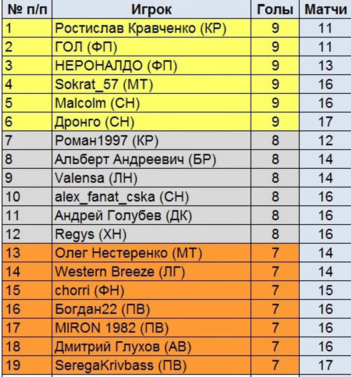 В списке бомбардиров нынче образовался секстет (не пугайтесь этого слова). Шестеро музыкантов на разные голоса пытаются вытянуть одну и ту же мелодию, соревнуясь, кто из них громче (и голеадористее).