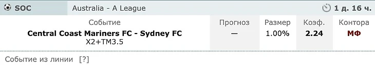 Еще предлагаю рассмотреть смешанную ставку, но на чемпионат Австралии. Субботний матч Централ Кост Маринерс и Сиднея. Ставка: Х2+ТМ3.5. Централ Кост - открытие этого сезона. Напомню, что в прошлом сезоне это была такая же безнадежная команда, как в этом Мельбурн Виктори. Удивительное преображение. Но это отчасти связано с тем, что топы начали плохо. И Мельбурн Сити, и Сидней постепенно набирали ход. И вот они уже входят в первую 6-ку, которая будет участвовать в плей-офф. Я до сих пор считаю, что Централ Кост не попадет в плей-офф, тк есть более достойные для этого команды. Но их игра в этом сезоне действительно выглядит неплохо. Сидней пока играет от раза к разу. Перейдем к цифрам: