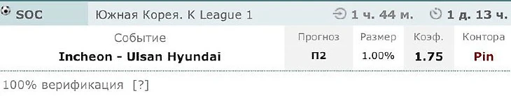 Инчхон - Ульсан П2. Тут все очевидно. На самом деле, Ульсан явный фаворит матча. Уж не 1.74 на победу должно быть точно, а 1.6 где-то. При этом в линии открытия бет365 примерно так и было. Как увидел на пинке за коэффициент 1.74, так взял сразу. Заметил ещё в прошлом сезоне тенденцию Ульсана: два-три матча серия неудач (а неудачей для Ульсана можно назвать и ничьи), а потом идёт победная серия (уж сколько матчей сказать не могу). Поражения и ничьи идут именно сериями. И вот уже два матча без побед. Грядёт битва с «великим» и «ужасным» Инчхоном. Отставание от Чонбука уже 6 очков. А уже начало второго круга. Я бы мог опять расписать (а на спортсе я регулярно пишу огромные простыни), почему Ульсан должен выиграть. И с подсчетами хГ, и с подробностями по каждой игре, но сегодня не очень много времени у меня есть. Просто, боюсь, коэффициент просядет. Советую присмотреться к данной игре. Очень неплохой вариант.