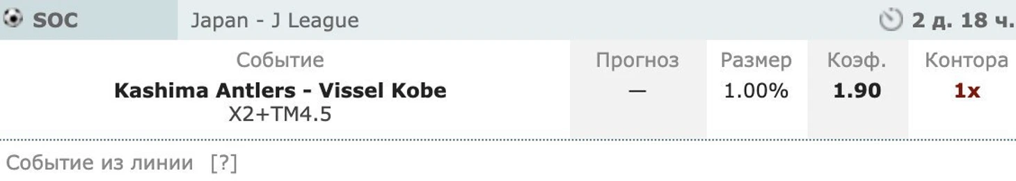 Доброе время! Предлагаю рассмотреть один из матчей, который будет сыгран на выходных. Это матч в Японии, Касима - Кобе. Хочу предложить комбинированную ставку на эту встречу. К сожалению, в пинке такого варианта нет, но зато почти во всех СНГ конторах можете найти его. Итак, Х2+ТМ4.5.