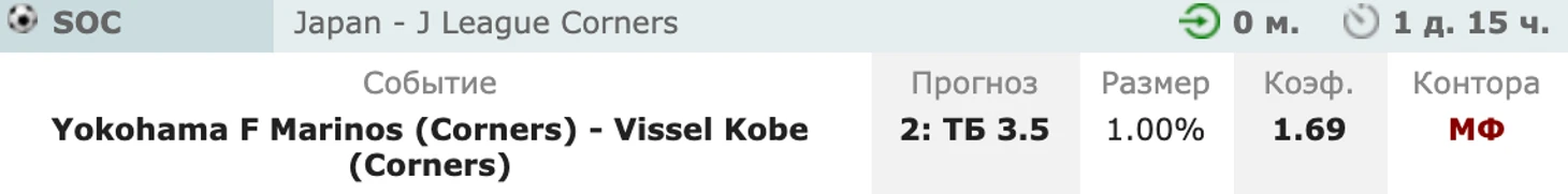 2. Йокогама Ф.М.- Кобе ИТБ2 3.5 угл. И еще один интереснейший матч выходных в Японии. Прогноз на него также, возможно, будет. Но сейчас угловые.