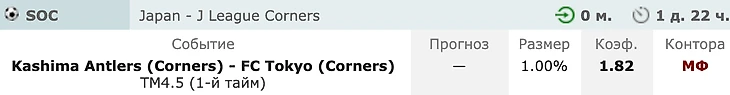 1. Касима - Токио ТМ4.5 Угл в 1-м тайме. Очень интересная встреча. Возможно, будет еще ставка на него. А пока угловые.