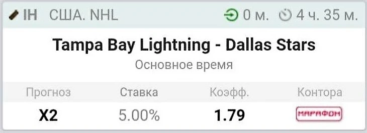 прогноз: Даллас Х2, кф 1.79 ✅ Даллас ИТБ(2.5) кф 2.05 и Тампа Бэй ИТМ(3) кф 1.76 – рассмотрим в качестве доп. вариантов Продолжаем нашу традиционную рубрику в блоге: "Ставим против Тампы без Василевского" Сегодня у Молний в старте сыграет К. Макэлинни, а завтра им предстоит b2b и более важный матч с прямым конкурентом за место в таблице (Флорида) Даллас же продолжает борьбу за плей-офф в концовке регулярки, следовательно, стараются брать очки в каждой игре. Мотивации у Старз сейчас достаточно и точно больше Тампы на предстоящий матч, чем допускаю воспользоваться, взяв гостей с отличным завышенным коэф. Телеграм-канал блога – прогнозы и информация на матчи НХЛ в ежедневном формате Подписывайтесь!