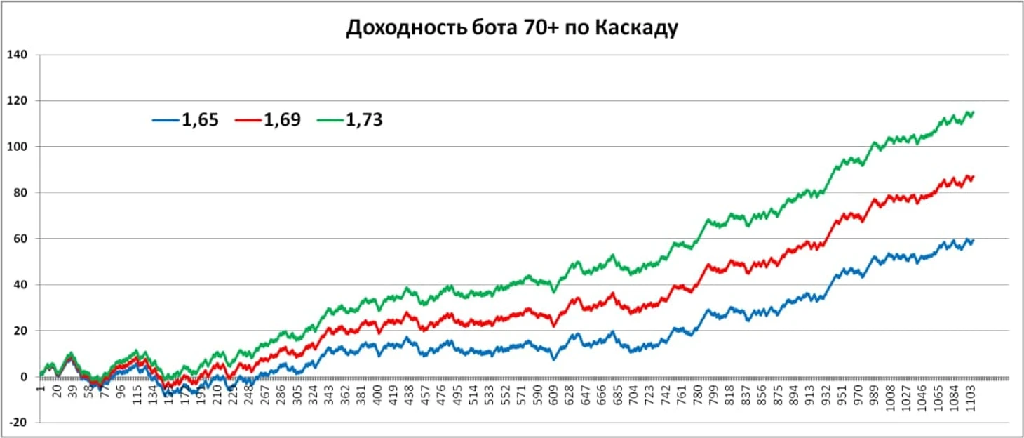 это график доходности, одного из наших ботов, работающего по отбору Каскад.