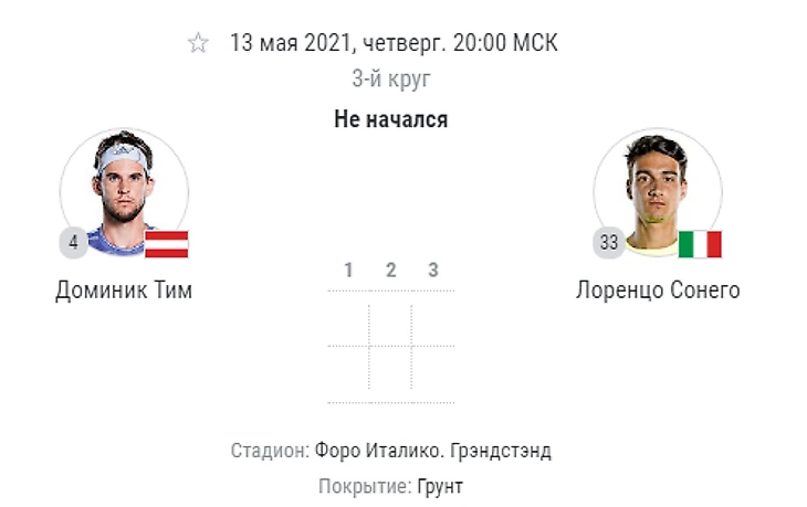 Тим пока не блещет результатами на любимом грунте, но скоро главный турнир в Париже и нужно набирать форму. В первом матче пришлось повозиться с Фучовичем, но третий сет был взят под ноль. В Мадриде Тим дошел до полуфинала, где проиграл будущему победителю Саше Звереву, который сейчас находится в шикарной форме. Сонего средний теннисист с неплохой подачей, но в розыгрышах уступает австрийцу. Турнир для итальянца домашний и это может придать ему дополнительных эмоций, но Тим объективно более классный теннисист и должен уверенно обыгрывать итальянца.