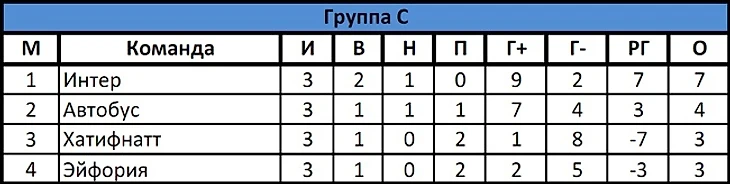 Интер, во многом благодаря варианту 22, одолел Эйфорию и забронировал себе место в четвертьфинале. Эта победа спасла Хатифнатт от вылета из КдС – забив всего 1 гол в групповом турнире, команда заняла третье, пока что спасительное, место засчёт минимальной победы над Эйфами в очной встрече. Автобус, благодаря разгромной победе над Хатти, скакнул с последней строчки на вторую – в столь сильной группе это отличный промежуточный результат.