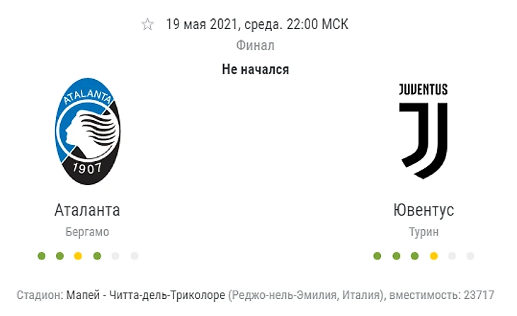 Аталанта выглядит предпочтительней туринцев, есть разнообразие исполнителей в атаке и команда находится в хорошей форме. В обороне у бергамцев периодически случаются провалы, все таки команда играет в первую очередь от атаки. Ювентус провалил сезон и рискует остаться без Лиги Чемпионов (и без Роналдо), кубок может немного скрасить сезон. Не сможет помочь команде Боннуччи, а значит будет сложнее оставить свои ворота в неприкосновенности. Матч с Интером показал, что в атаке Ювентус может показать неплохую игру и моменты у него будут. Кубок это всегда немного лотерея, но матч должен получиться результативным, уступающей команде некуда будет деваться и придется рисковать и идти в атаку.