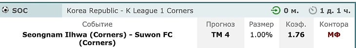 2.Сувон с данным тоталом: 4-3-11 (1-2-5 в гостях). Сувон в среднем создает в 1-м тайме 1.6 угловых (0.6 в гостях); в среднем допускает 1.9 (1.4 в гостях).