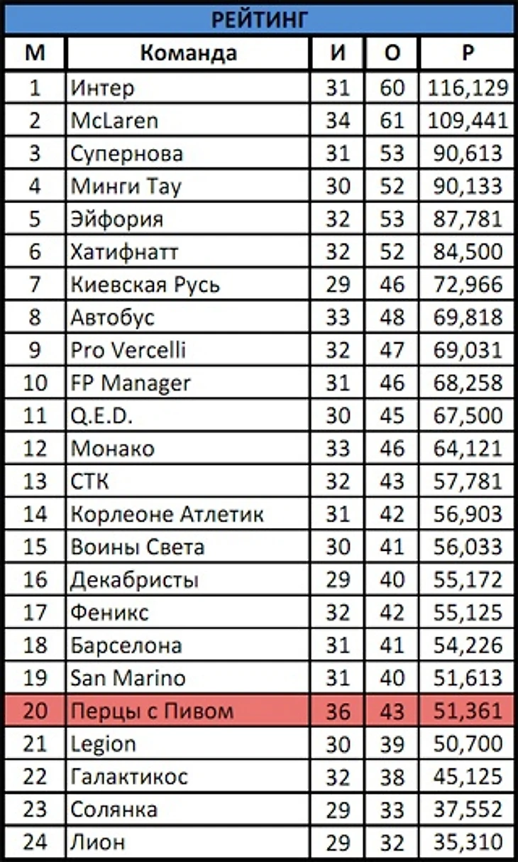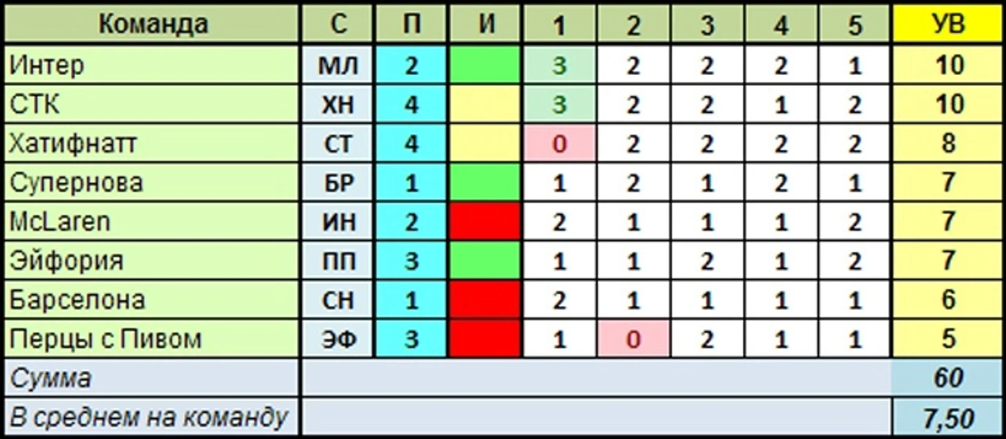 Лучшая команда тура по сумме УВ в целом: Интер, СТК – 10 вариантов