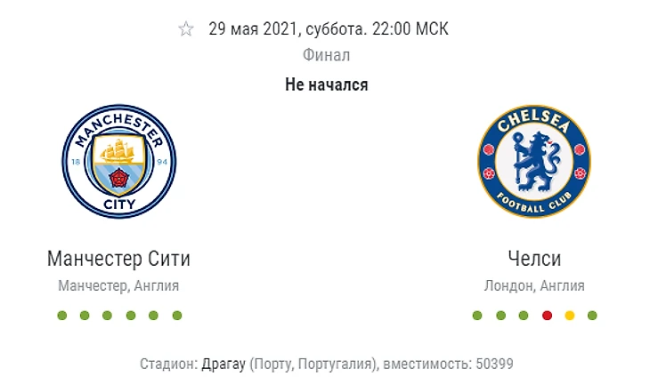 Манчестер Сити наконец-то смог добраться до финали Лиги Чемпионов и является фаворитом предстоящего матча. Челси смазал конец сезона проиграв кубок и потерпев поражение в чемпионате, но к сегодняшнему матчу это привязывать не стоит. Не так давно Челси уже побеждал в Лиги Чемпионов с тренером принявшим команду посреди сезона, шанс повторения такой истории не очень высок. Гвардиола опытный тренер, который побеждал во всех клубных турнирах и этот опыт может сыграть решающее значение. Тухель сумел отладить обороны, но без везения победить Сити будет невозможно.