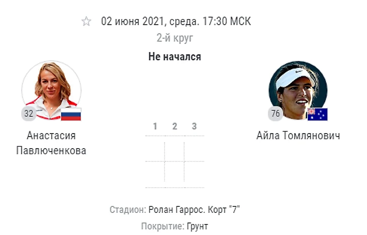 Анастасия провела хороший турнир в Мадриде и на кортах Франции начала с уверенной победы в первом круге. К матчу Настя подошла в хорошей форме и Томлянович по стилю удобный для нее соперник. Козыри Павлюченковой это подача и мощный атакующий теннис. Томлянович может доставить проблем россиянке, но под мощным натиском должна уступить, стоить также отметить проблемы австралийки с травмами и с характером, часто отдает выигранные матчи.