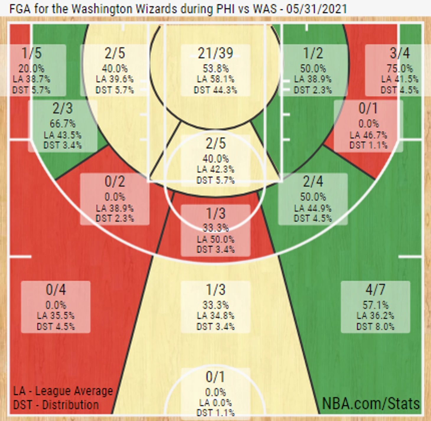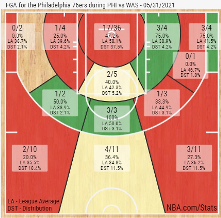 На выходе имеем серию где все держится на Эмбиде, если он здоров то Вашингтон безоружен, как не пытайся Бил или Уэстбрук набирать очки и действовать опасно, все нивелируется камерунцем. Сегодня его не будет, и Бил с Расселом получал еще большую свободу в атаке, а вот Фила становится заложником своей недальновидности, приходится выпускать Ховарда и Симмонса вместе, при чем оба не кидают дальше чем метр от кольца, и Вашингтон об этом знает, и теперь их задача максимально упрощается, остается закрыть еще троих людей, где Харрис, Карри и мертвый Грин. Задача не так то и тяжела.