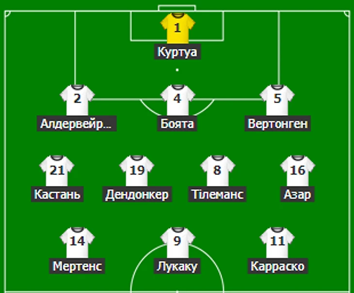 Бельгия без Азара и ДеБрюйне, оба травмированы. В защите все просто, двойка из Тоттенхема и Боята из Герты. Вертонгена я записал к англичанам, хотя он уже в Японии играет. А вот дальше сплошь атакующие игроки, брат Азара пухлого слева в полузащите, Кастань справа, и эта схема легко трансформируется в 4-3-3. В центре поля парочка из АПЛ - Дендонкер и Тилеманс. В нападении Мертенс у которого всего 9+8 за Наполи в сезоне, парень уже постарел. слева Карраско у которого 6+10 в Атлетико. На острие Лукаку.